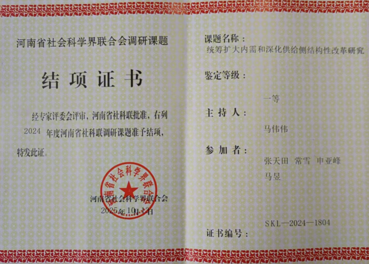 近日,河南省社会科学界联合会公布了2024年度调研课题获奖名单,太阳集团tyc151马伟伟老师主持的《统筹扩大内需和深化供给侧结构性改革研究》项目荣获一等奖。该项目针对河南省在统筹扩大内需和深化供给侧结构性改革过程中所面临的问题,提出相应的对策建议。未来,太阳集团tyc151将继续引导科研团队开展前瞻性、原创性研究,为区域经济发展贡献力量。